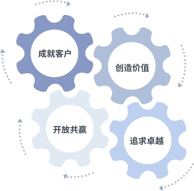 成就客户是一切决策的出发点,创造价值是衡量所有工作的标准,追求卓越是GOWIN趣胜亚洲做事做人的态度,开放共赢是GOWIN趣胜亚洲的格局也是最终的结果。价值观的齿轮环环相扣,推动着组织里的每个人不断向前。